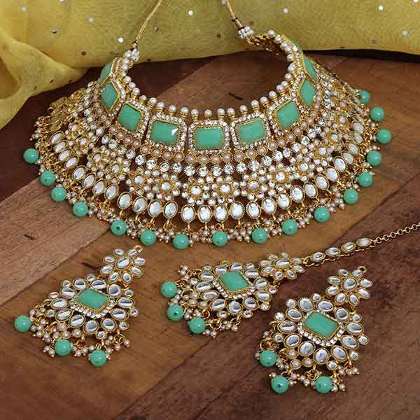 Indian Wedding Jewelry Set I Kundan Necklace Set I Necklace, Earring and Tikka Set I Statement Jewelry I Parrot Green, Gold Rhinestone Set