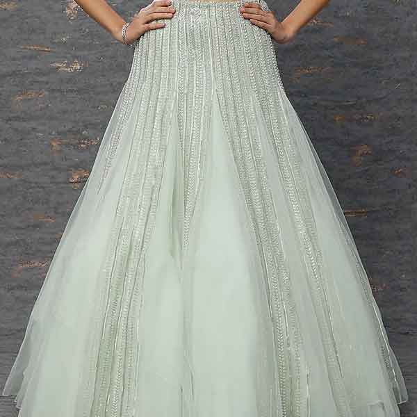Featuring a mint green lehenga in net base. It is paired with a matching embroidered blouse and a dupatta.