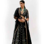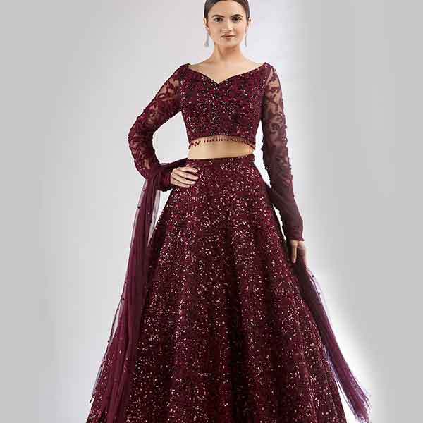 Maroon high waist lehenga with sequin embroidered floral motifs. Comes with blouse and sheer dupatta.