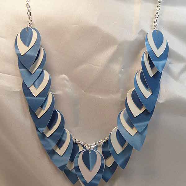 Paper necklace in a teardrop shape. This is one of 2 new styles. This teardrop shape gives the right “sway factor” that is a goal in my work. The paper is from paper swatchbook covers. Total hanging length is 13.5″.