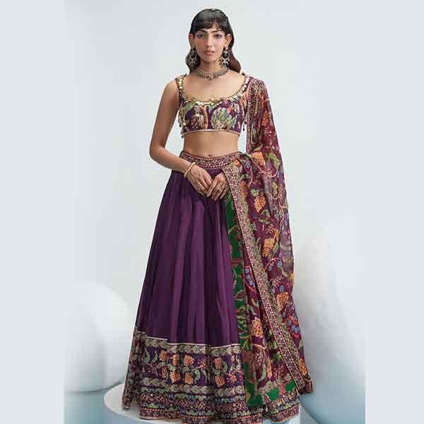 Purple satin organza lehenga with multi colored floral prints on hem with embroidered highlights. Comes with textured cotton embroidered blouse & organza dupatta.